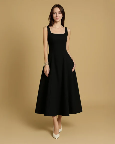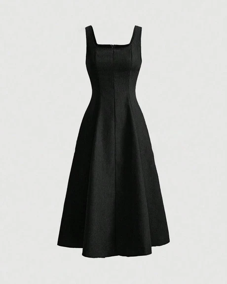 Timeless and chic, this scoop neck dress features a fitted bodice, wide straps, and a flared midi hemline for a flattering retro silhouette. The classic black shade makes it versatile, while the cotton blend keeps it breathable and comfortable. Perfect for both casual and evening outings, this scoop neck dress is an easy choice for effortless elegance.