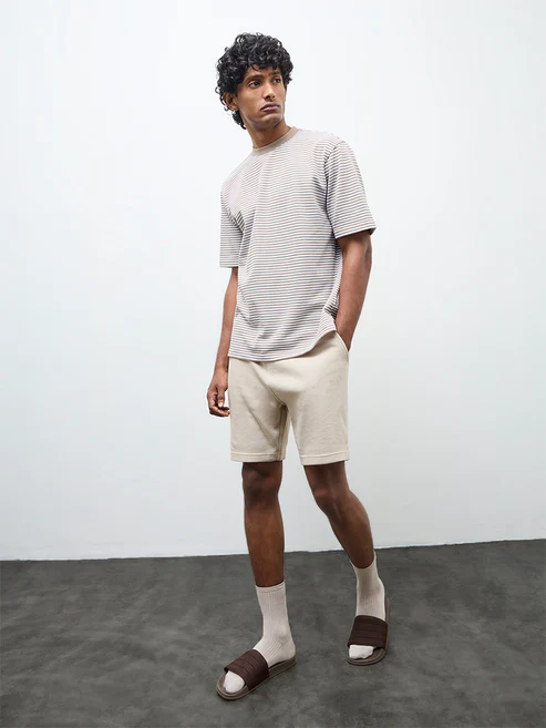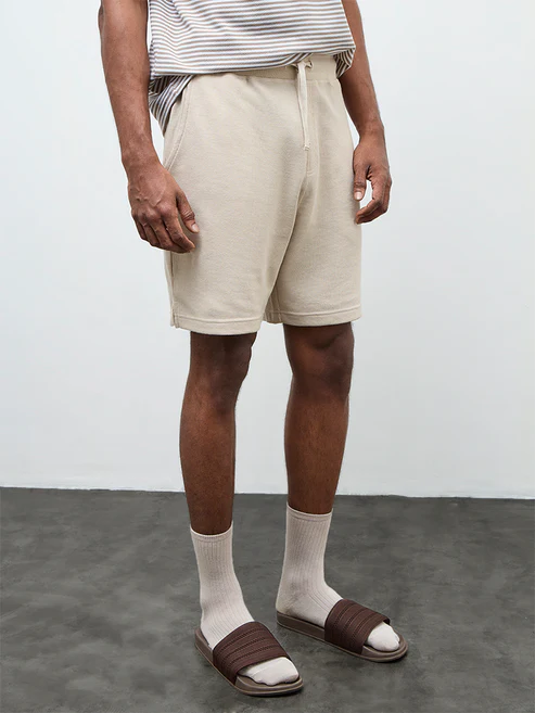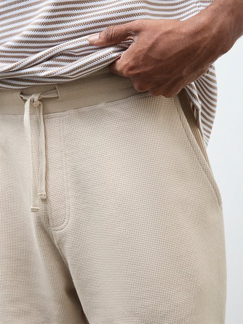 WES Lounge brings relaxed comfort to your everyday lineup with these beige shorts. Crafted from a soft cotton-blend fabric, they feature a waffle-textured finish that adds subtle detail to the minimal design. Styled with an elasticated waistband and adjustable drawstring, they ensure an easy fit, while side pockets offer everyday practicality for lounging or casual outings.